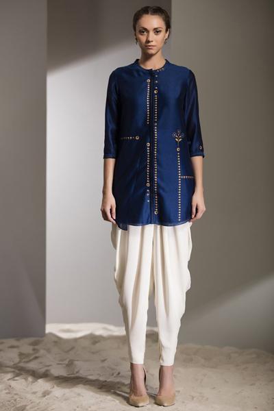 Get ready to revel in dark blue with this screen printed button-down shirt. Simple and elegant patterns with fine detailing on the placket. Material: Chanderi.